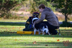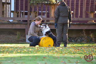 Olin odottanut että Salli suhtautuisi testin osa-alueisiin itselleen tyypillisellä, varsin rauhallisella tavalla. Kuinka väärässä sitä ihminen voikaan olla. :D Alkuhöpinöiden jälkeen koitimme leikittää Sallia, mutta sehän on aivan turhaa. Salli ei ole tähän päivään mennessä innostunut vetoleikeistä, joten miksipä se innostuisi nytkään. Tämä homma oli aika pian selvä, joten siirryimme "kentälle". Kelkan Salli suoritti ihan mukavasti. Kesti aika kauan ennen kuin se alkoi reagoida kelkkaan, mutta tuli sieltä lopulta ihan kunnon räkytys ja väistöliike. Salli kuitenkin hyvin pian tuli itse tutustumaan kelkkaan, eli hoiti tilanteen varsin hyvin.